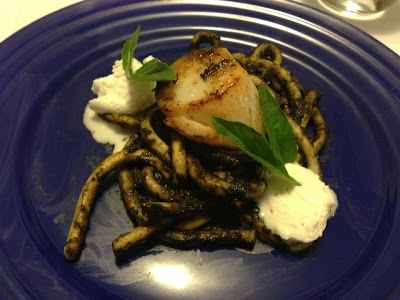 As we finished the last drops of our pre-prandial cocktails, the appetisers began to appear in earnest. Clams casino dressed to richly with toasted breadcrumbs providing crunch and bacon lending an unmistakable smokiness. A fabulous macaroni and cheese topped with steak tartare, an unexpected combination that was at once both comforting and titillating. Decadent seared foie gras best considered when at its simplest. The beer and cheese soup's luscious texture belied a sharpness on the palate. Perhaps most surprising was the fact that I ate any of the wedge salad at all, given my disinclination for lettuce. A bottle of